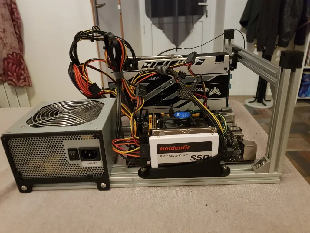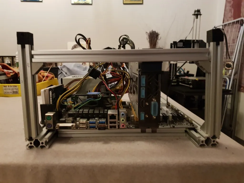 J’ai entrepris la création d’un PC de salon Media Center, conçu dans l’esprit d’un rig de mining, où tout est volontairement ouvert pour un style minimaliste et une meilleure circulation de l’air.
