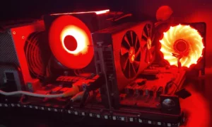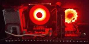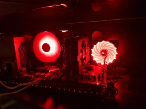L’ensemble de la construction a été pensé pour allier fonctionnalité et esthétique. La structure ouverte met en valeur les composants tout en facilitant leur refroidissement. Le point culminant du projet réside dans l’ajout de ventilateurs à LED, qui apportent une ambiance lumineuse dynamique et moderne, idéale pour un PC de salon.