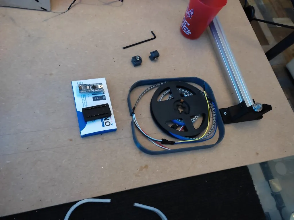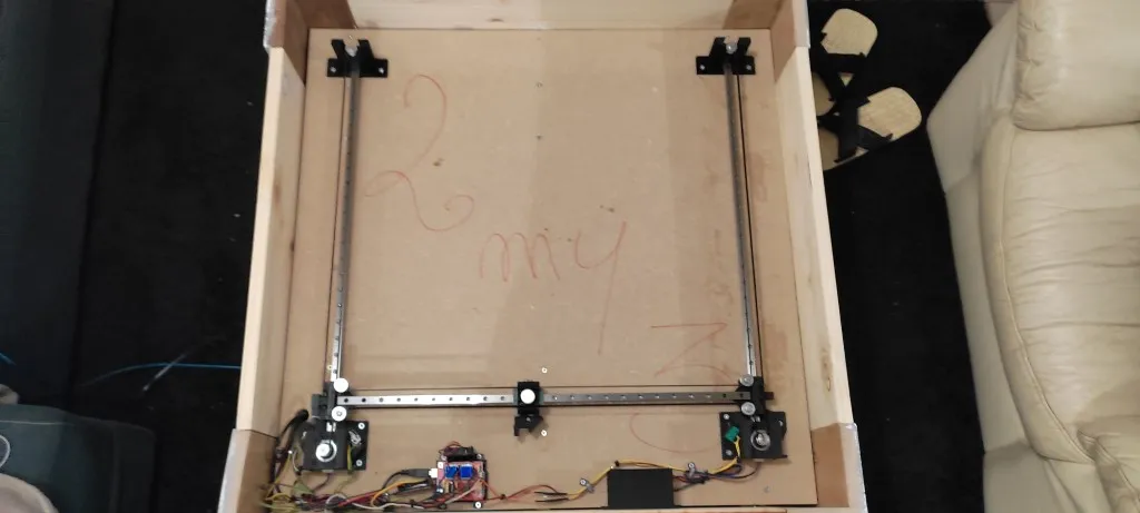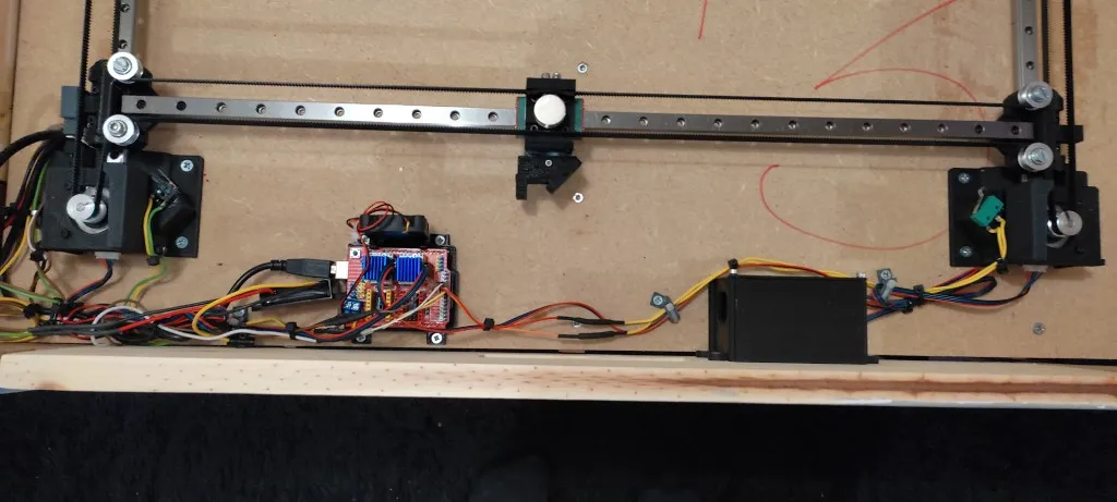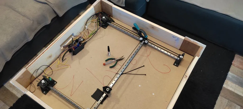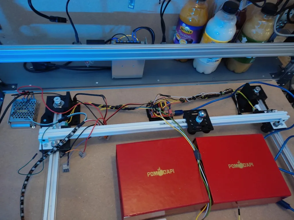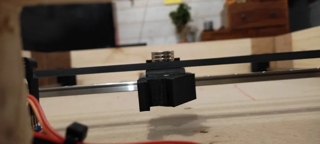 Le mécanisme repose sur des rails en aluminium 2020, deux moteurs pas-à-pas Nema 17 et une courroie GT2. Ces éléments garantissent la précision et la fluidité des mouvements de la bille aimantée.
