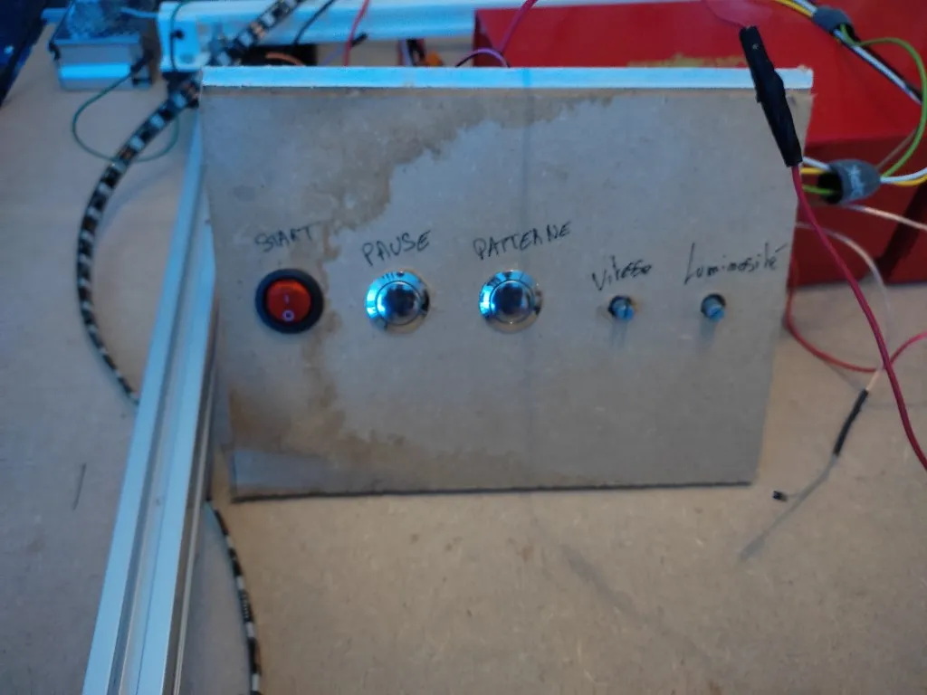 - Une Arduino Nano gère l’éclairage et les mouvements de la bille grâce à un panneau de commandes équipé de boutons poussoirs et de variateurs.